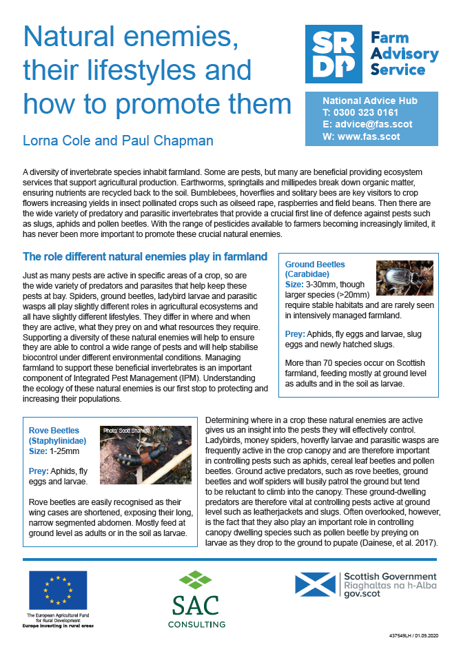 A diversity of invertebrate species inhabit farmland. Some are pests, but many are beneficial providing ecosystem services that support agricultural production. Earthworms, springtails and millipedes break down organic matter, ensuring nutrients are recycled back to the soil. Bumblebees, hoverflies and solitary bees are key visitors to crop flowers increasing yields in insect-pollinated crops such as oilseed rape, raspberries and field beans. Then there are the wide variety of predatory and parasitic invertebrates that provide a crucial first line of defence against pests such as slugs, aphids and pollen beetles. With the range of pesticides available to farmers becoming increasingly limited, it has never been more important to promote these crucial natural enemies.