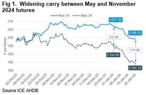 Domestic demand in the feed and ethanol sectors has been below expectations also contributing to falling UK feed wheat prices. The option to carry old crop into the next season becomes increasingly attractive for those that can do so, with the carry from May 2024 to November 2024 futures reaching £15/t.
