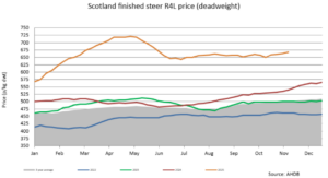 And here we are in December! However, finishers hoping for increased seasonal demand and a price uplift could be lacking festive cheer. ‘Static’ best describes the beef trade currently, with deadweight prices marginally lifting over the past few weeks but certainly not lifting as much as expected for the Christmas trading period. Prices quoted for week ending 22 November were in the region of 670p/kg/dwt, up 4.2p/kg from the previous week.