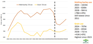 Nationally, AHDB now forecasts human and industrial barley usage at 1.58 Mt, down 214,000 tonnes from last season and the lowest level recorded since digital records began in 1990/91. Analysts cite reduced consumer spending, changing drinking habits, and rising costs as key pressures, alongside reports of distilleries being mothballed and limited export opportunities.