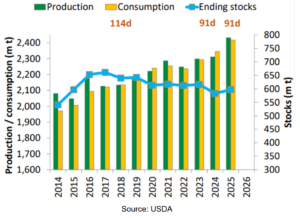 Black Sea exports remain constrained despite ample supply. War-related logistical disruptions in Ukraine and slower shipments from Russia have reduced export flows year-on-year. Ukrainian maize exports are down roughly 30% and wheat by about 25%. Although this does not signal a global shortage, it redistributes demand toward the EU and the US, tightening the effective export balance outside the region and lending price support.