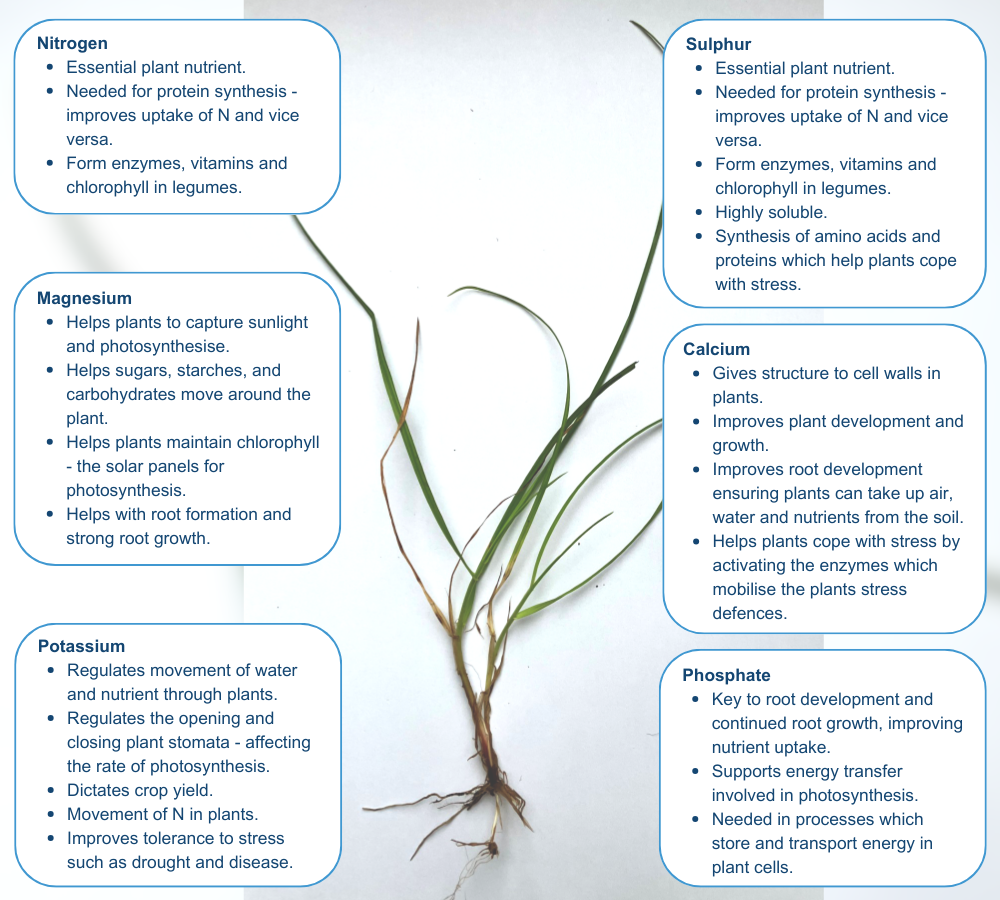 Grass plants absorb water and nutrients through their root systems. Nutrients in the soil are dissolved in water and can then be absorbed by plant roots. The major nutrients required for healthy development and growth are Nitrogen (N), Phosphorous (P), Potassium (K), Calcium (Ca), Magnesium (Mg) and Sulphur (S). While these nutrients play different roles in plant and root development, the plant is dependent on their interaction and availability at optimum levels to be able to function and grow effectively