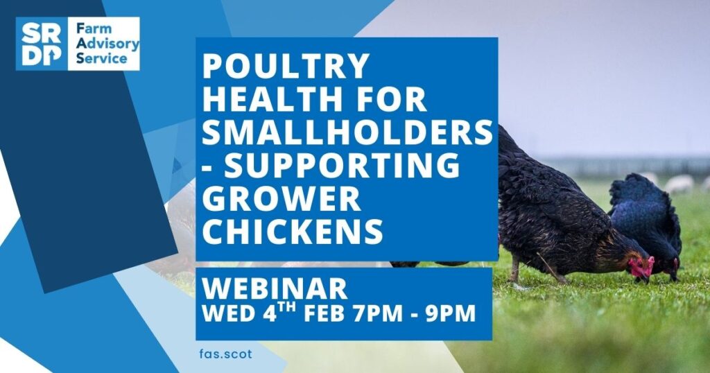 Join us on Wednesday 4th February from 7pm, where we will be joined by Caroline Robinson of SRUC, for an introduction for small scale keeping of grower chickens up to laying or slaughter age, where we will cover housing, feeding, health and welfare, lighting and practical tips for supporting grower chickens through to laying followed by a Q & A session.  This is the 3rd webinar in a series of 4.